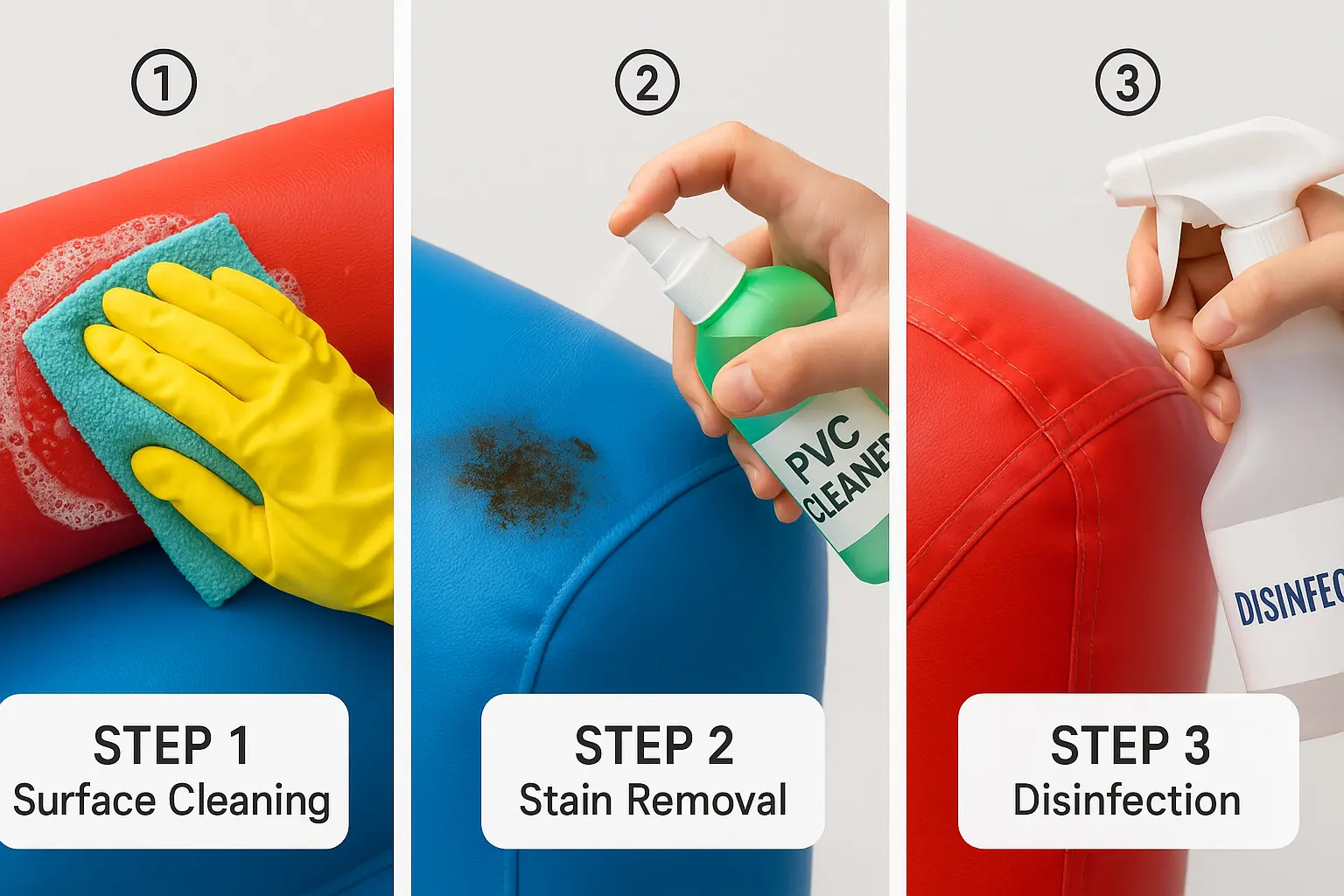 For persistent stains that won’t budge with regular cleaning, apply a dedicated PVC cleaner specifically formulated for inflatable materials. Important: Avoid harsh chemicals including: