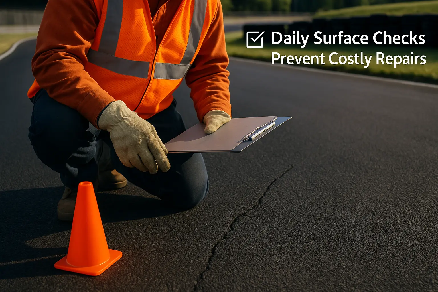 Start each operating day with a thorough visual inspection. Walk the entire track perimeter, looking for fresh cracks, surface deterioration, or debris accumulation. Pay special attention to high-stress areas like tight corners and braking zones where surface wear accelerates.
