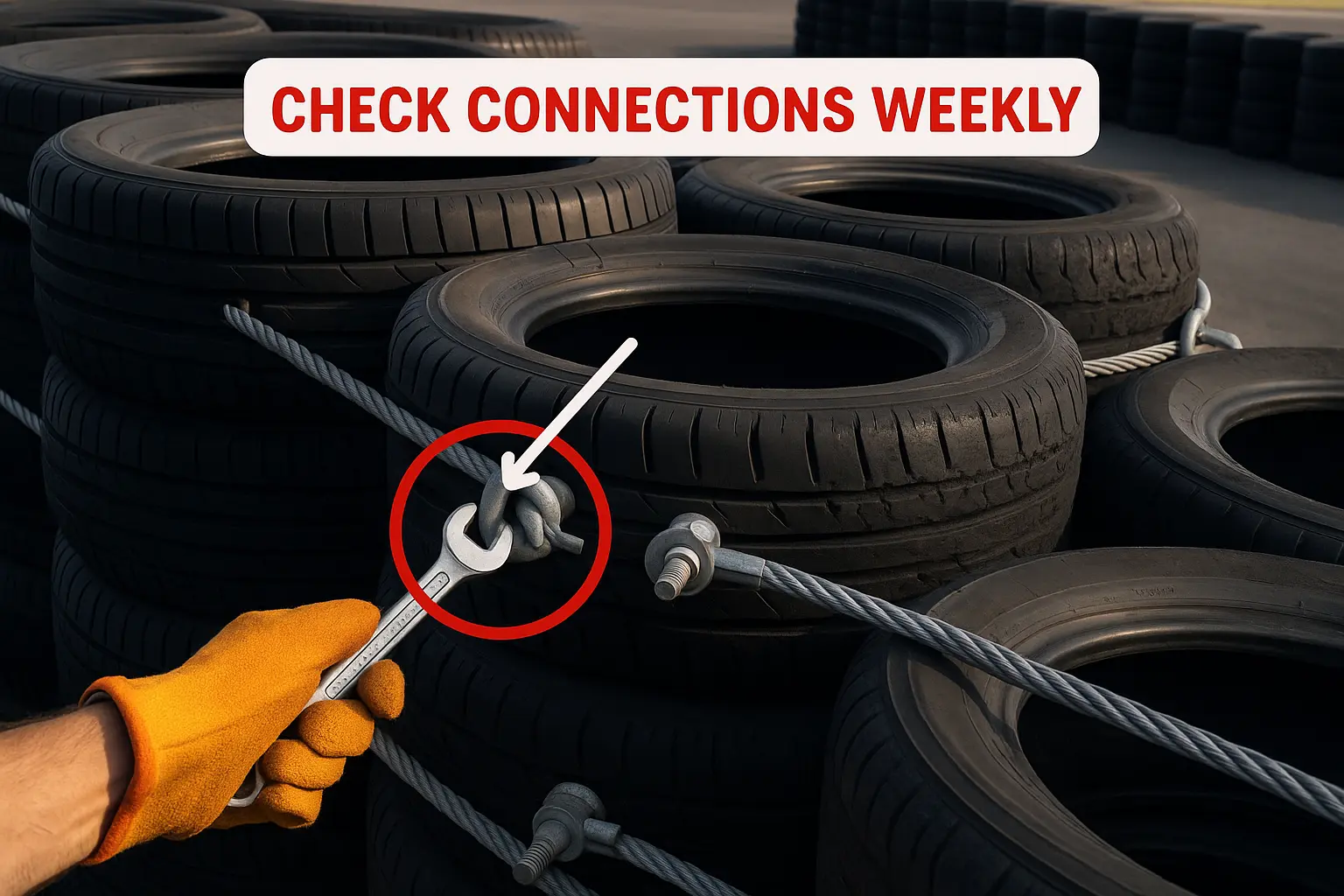 Verify tire connections remain secure. Whether using cables, bolts, or strapping, connection integrity determines barrier effectiveness. Replace worn connectors immediately. Check that tires remain properly filled or packed—deflated or loose tires reduce protective capability.