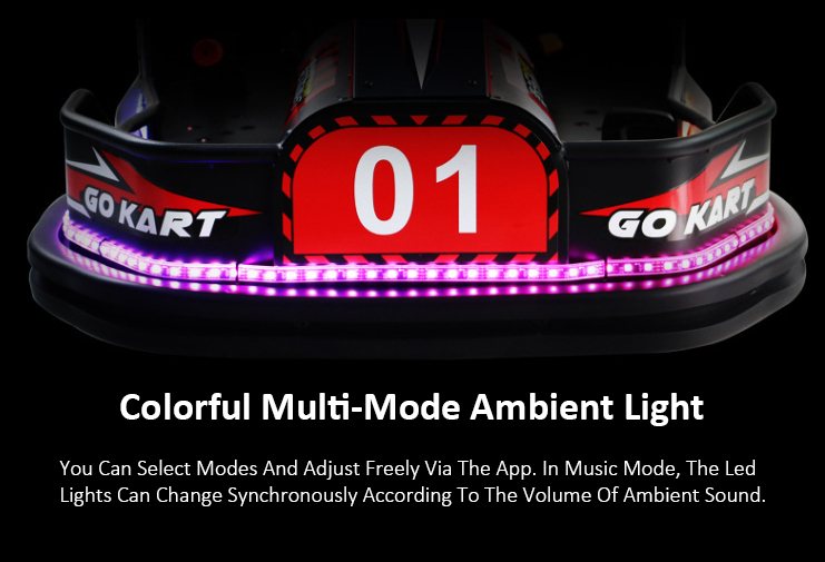 The kart comes with Bluetooth-controlled colorful LED atmosphere lights. By connecting through a mobile phone, users can freely adjust lighting color, mode, speed, brightness, and effect length. Music mode allows the lights to change according to surrounding sound and rhythm.