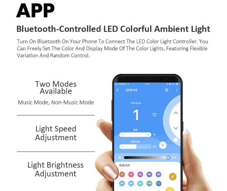 Yes. The LED atmosphere lights can be controlled through a Bluetooth APP, including color, speed, brightness, and lighting mode.