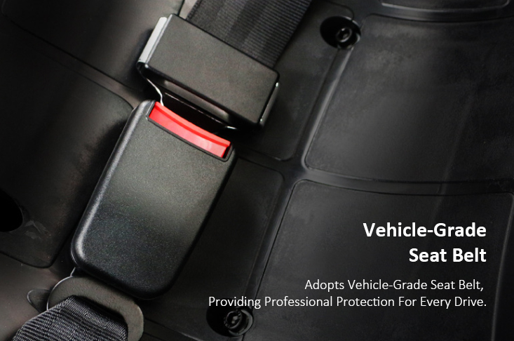 The kart includes a heavy-duty metal button, power switch, anti-theft key switch, and an automotive-grade safety belt to improve daily operating safety and durability.