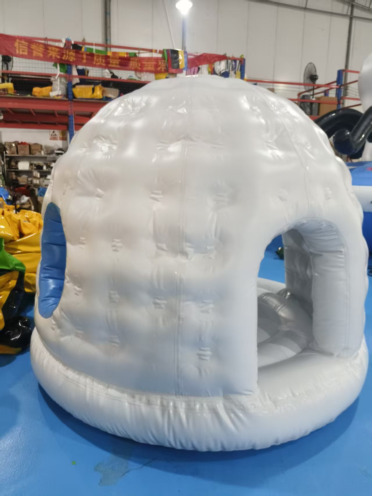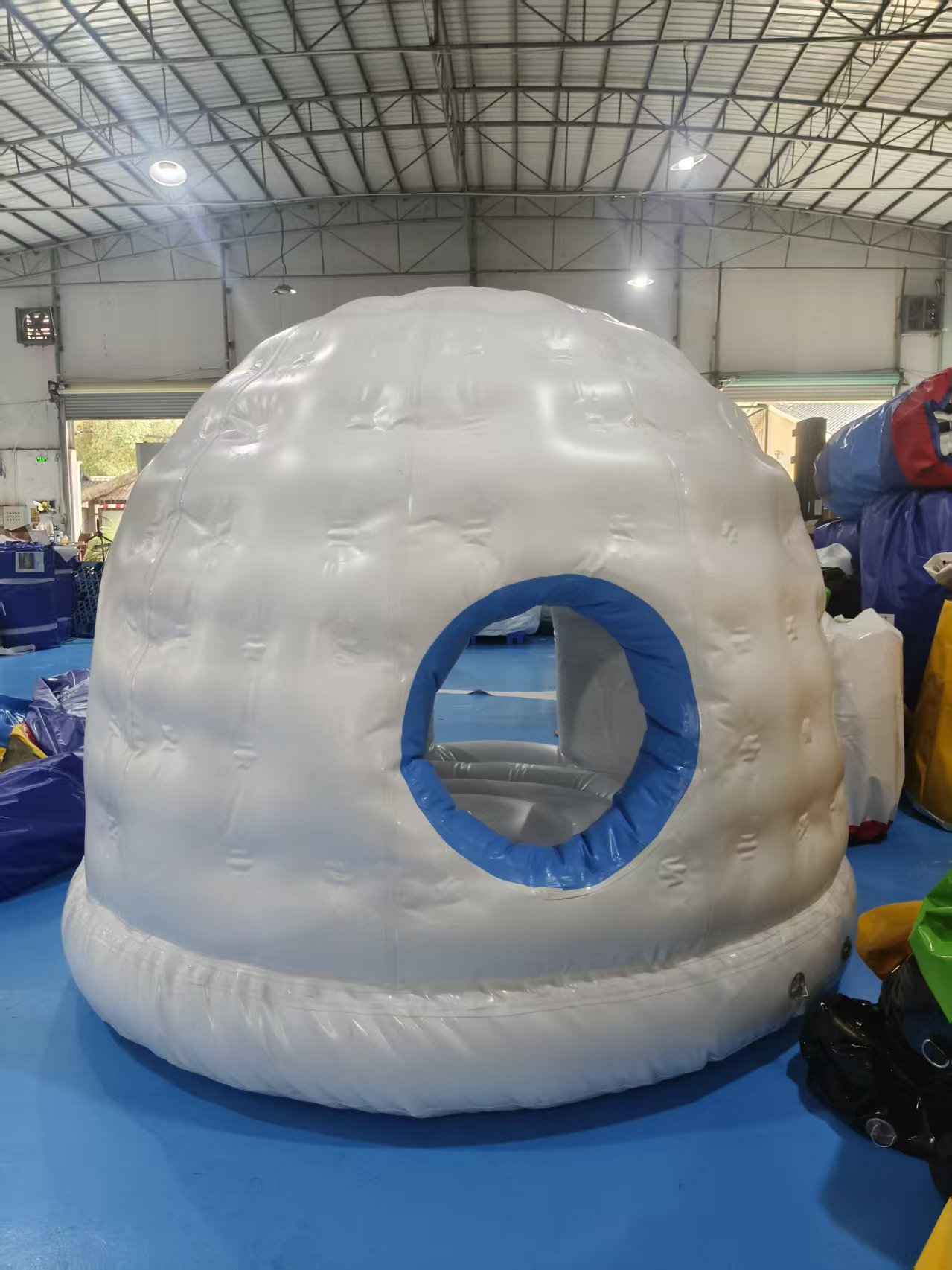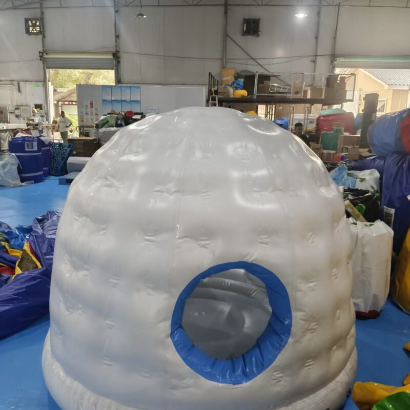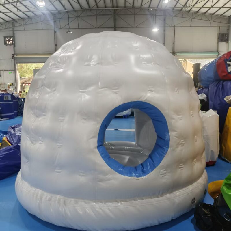 • Igloo Architecture: The entire structure is shaped like a traditional igloo, with a rounded dome top, textured white walls, and a blue-accented arched entrance.