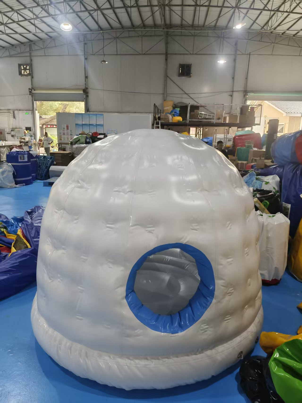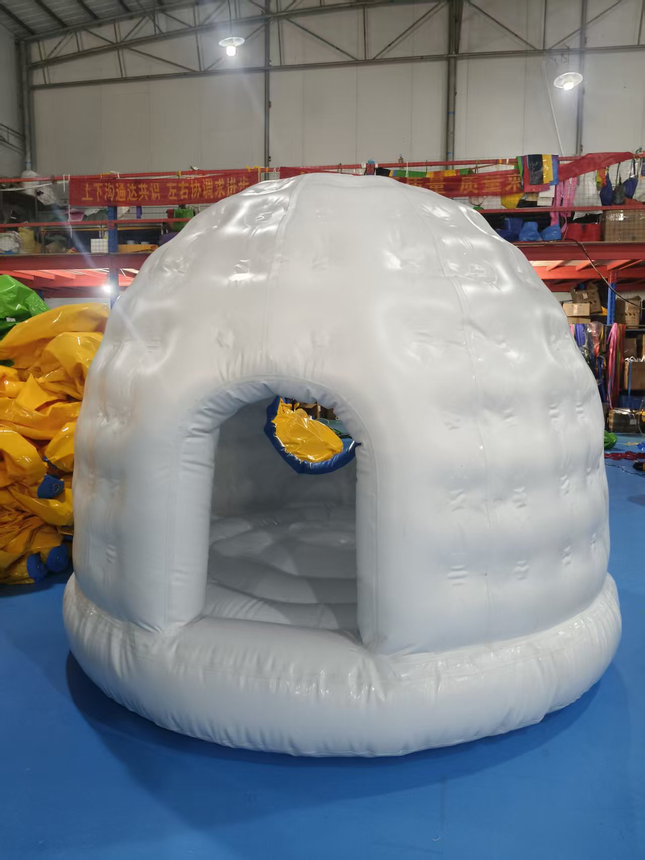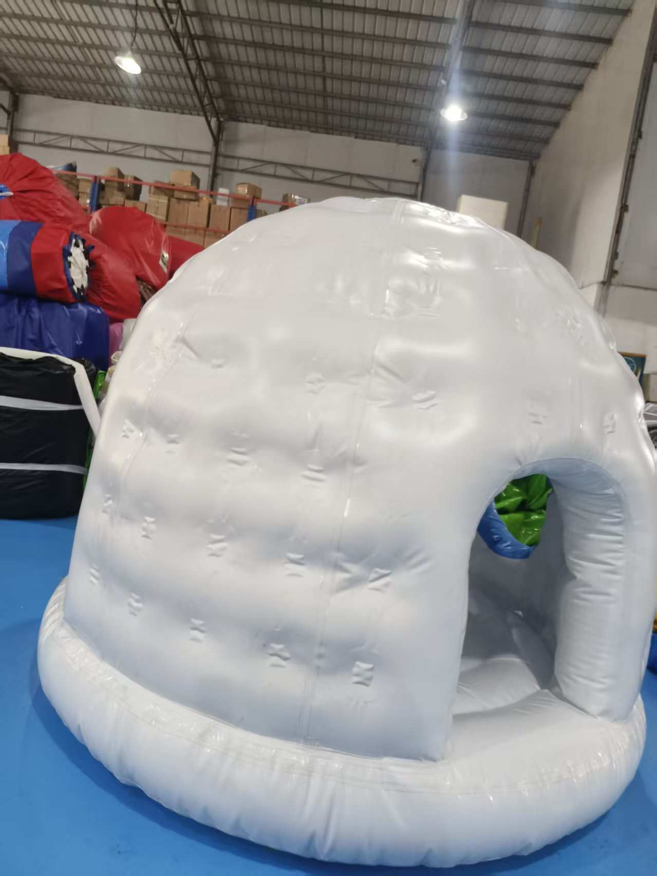 • Igloo Architecture: The entire structure is shaped like a traditional igloo, with a rounded dome top, textured white walls, and a blue-accented arched entrance.