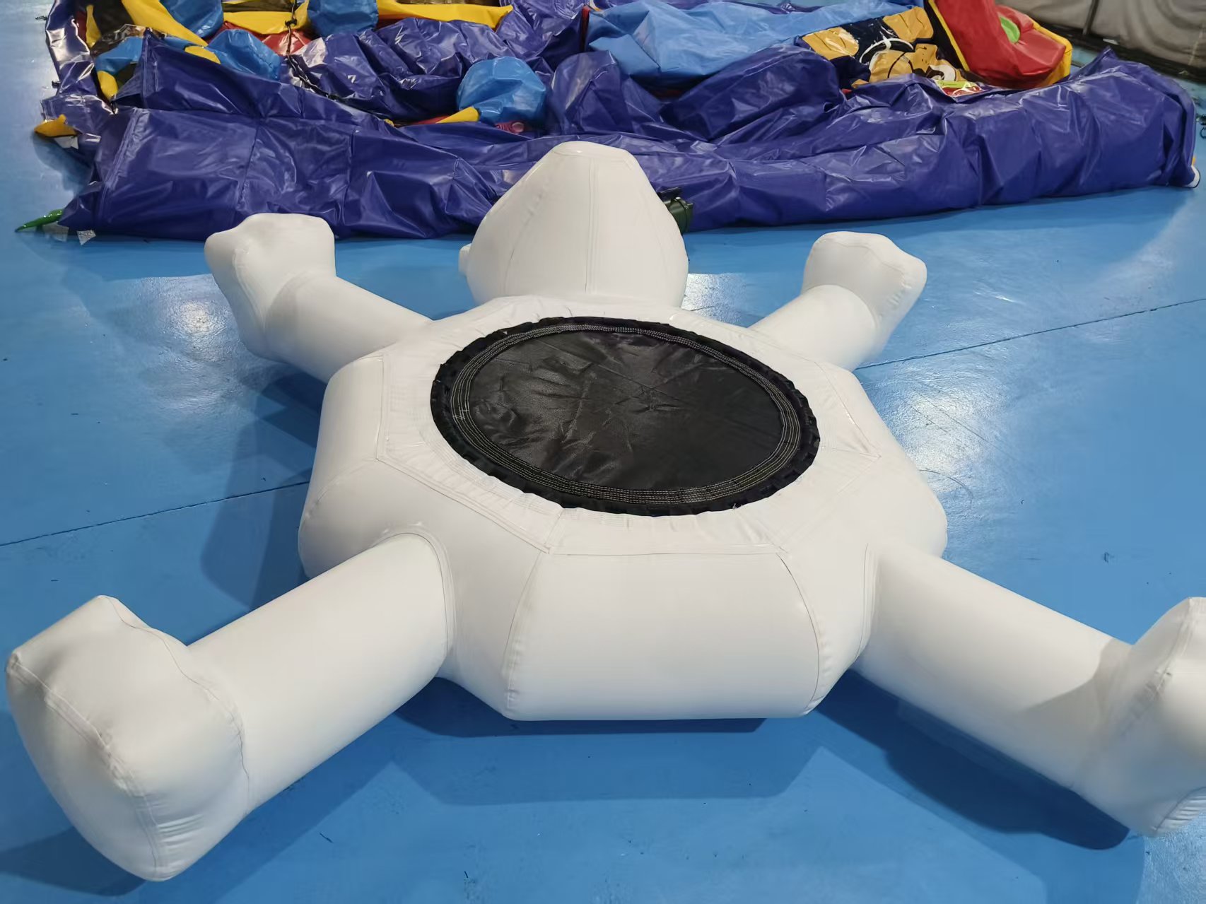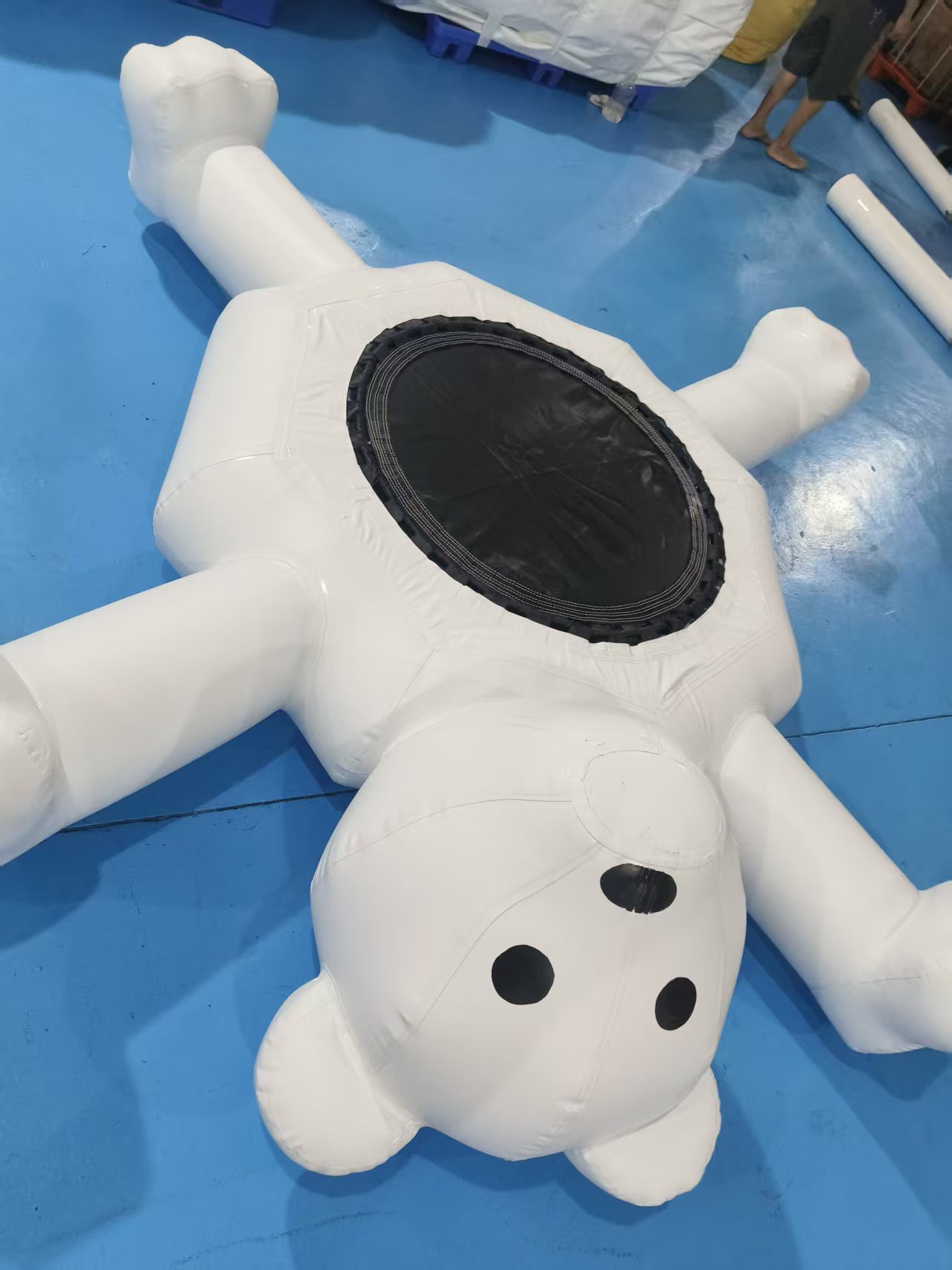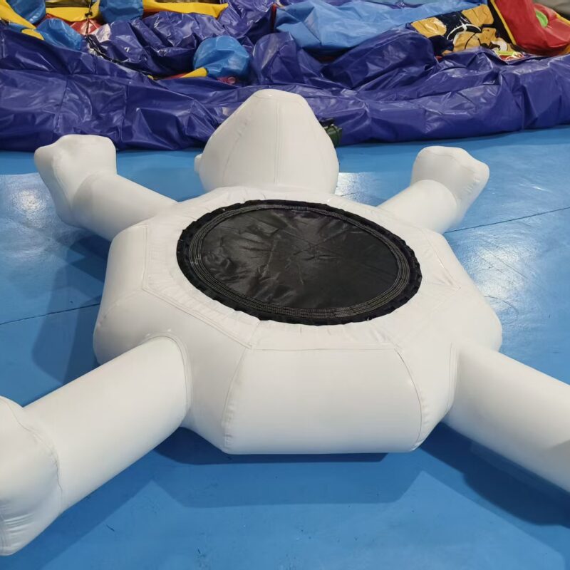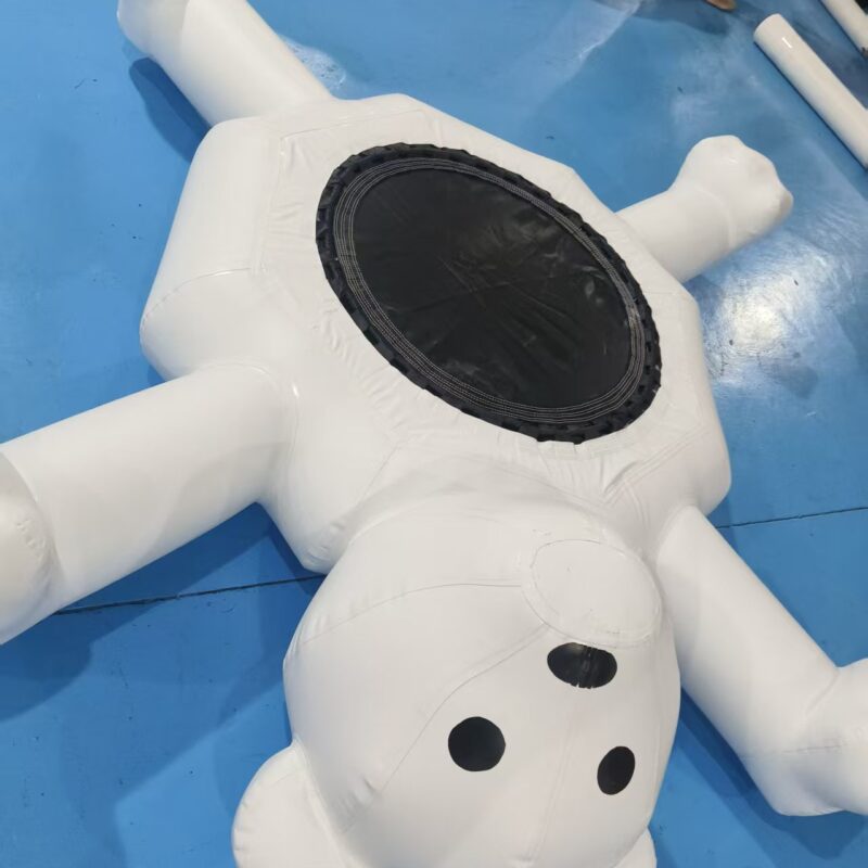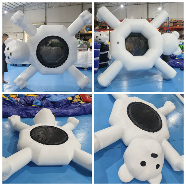Adorable Polar Bear Design: Whimsical polar bear character with outstretched arms and legs, featuring a friendly face and central trampoline-style bounce surface.