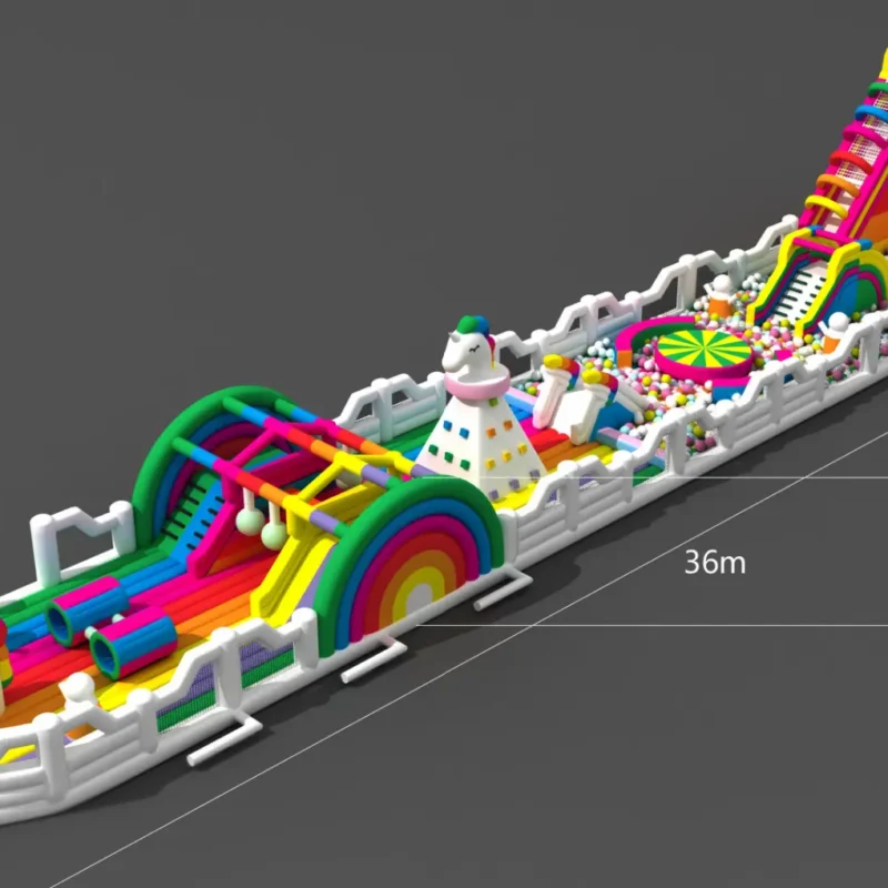 🌈 Multi-Stage Challenge System This dynamic obstacle course includes climbing walls, crawl tunnels, balance beams, slide escapes, bouncing barriers, rope challenges, and speed zones strategically arranged across the 36-meter track. The progressive difficulty system ensures participants face escalating challenges while building confidence, coordination, and competitive spirit through high-energy rainbow obstacle adventures and timed racing competitions.