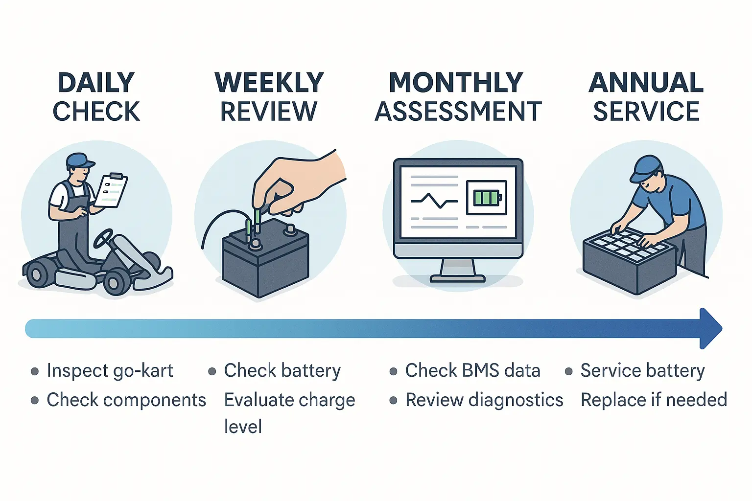 Professional servicing should occur at manufacturer-recommended intervals, typically annually for regularly used karts. These comprehensive inspections include detailed BMS diagnostics, capacity testing to assess battery health, thermal imaging to identify hot spots that might indicate developing problems, and verification that all safety systems function correctly.